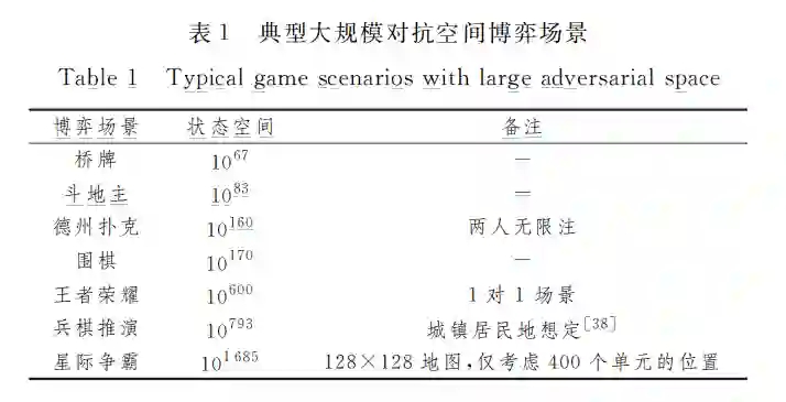 在一些复杂博弈环境中,状态空间和动作空间的规模都 非常庞大(见表1),搜索遍历整个对抗空间,无论是在时间约 束上还是在存储空间约束上[33]都难以满足要求.