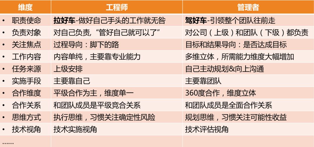 第三个角度,从关注焦点来看,也就是什么对你来说是最关注的。工程师一般是过程导向的,因为他们需要一步一步把工作执行到位,眼睛盯着的常常是“脚下的路”;而管理者是目标和结果导向的,他们时时关心目标和前进方向,盯着“远方的目标”,因为他们得决定要带着团队去哪里。