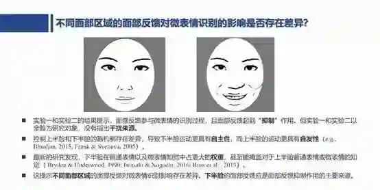 吴奇博士针对这一问题对微表情识别方面进行了一系列研究。针对面部反馈的增强对高/低强度微表情产生的影响进行研究,结果与宏表情识别结果相反,面部反馈对微表情识别是有抑制作用的。