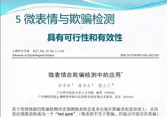 Timothy R. Levine等人对利用各种线索进行欺骗检测的正确率进行统计,发现这些线索的正确率呈正态分布。瞳孔和音高两个线索是目前研究较多、较为可靠的欺骗线索。利用微表情线索进行欺骗检测的生态效率较高,但研究内容较少。申博士向我们分享了他发表在《心理科学进展》上关于微表情在欺骗检测中的应用文献综述。