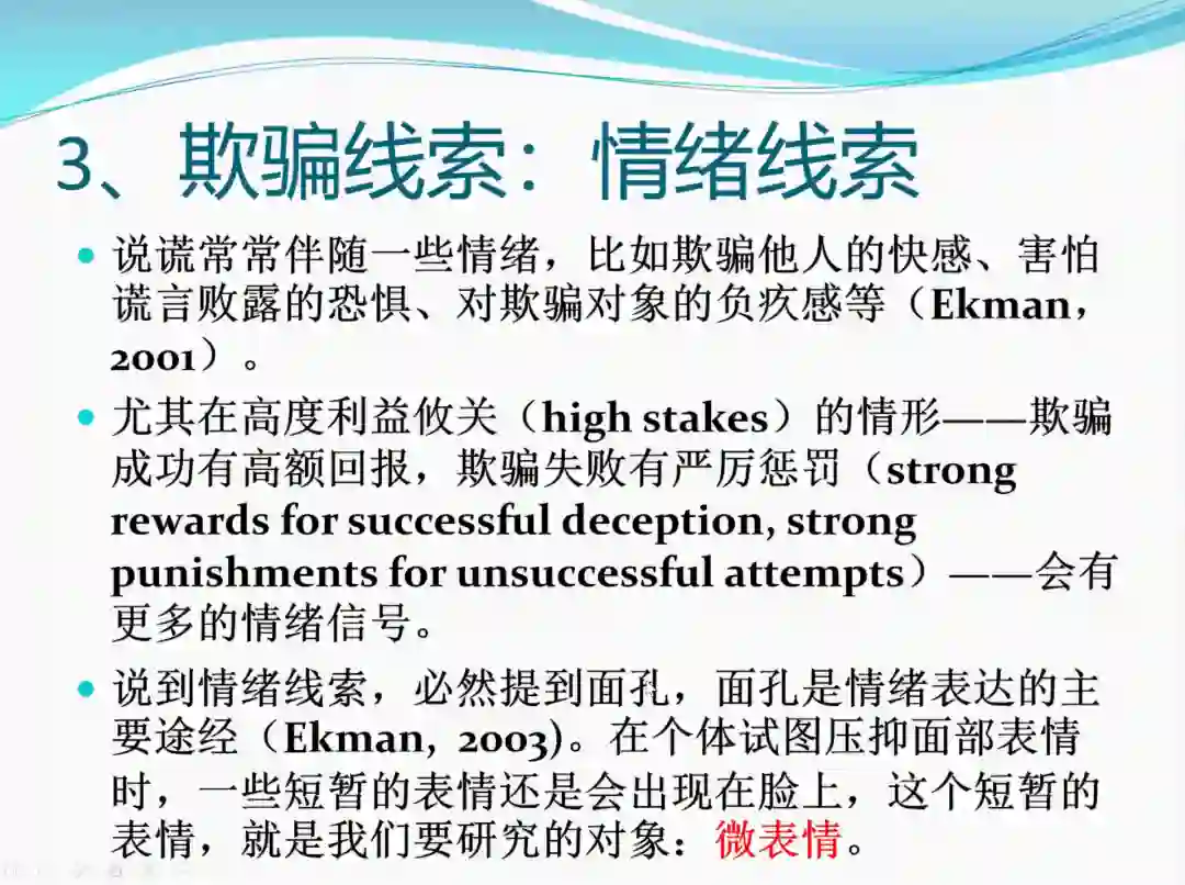 从2001年至今,世界各国发生的恐怖袭击等案件,使我们逐渐意识到对“人”本身进行安检的重要性。然而,当人们进行欺骗行为时,往往是有线索可循的,因此引出探索欺骗线索的重要性。欺骗检测的线索包括视觉线索、言语/非言语线索、生理线索和情绪线索等。在欺骗的过程中往往伴随着一些情绪的产生,当这些情绪泄露出来时,就会引发微表情的产生。