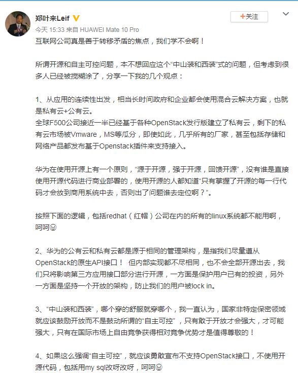 6 月 29 日,华为云总裁郑叶来在个人微博发文谈及云计算行业的开源和自主可控问题。他表示,国家非特定保密领域就应该鼓励开放而不是鼓动所谓的“自主可控”,“如果这么强调自主可控,就应该勇敢宣布不支持OpenStack接口,不使用开源代码。”