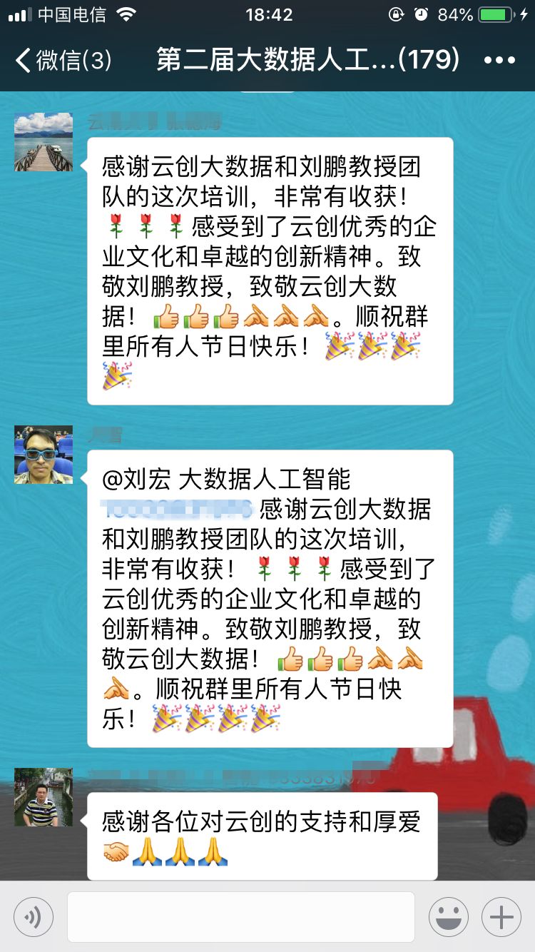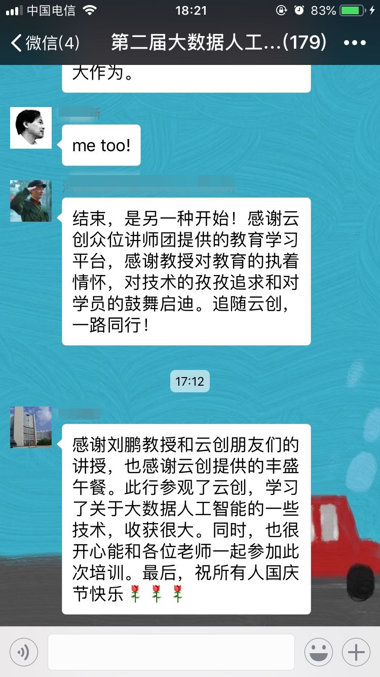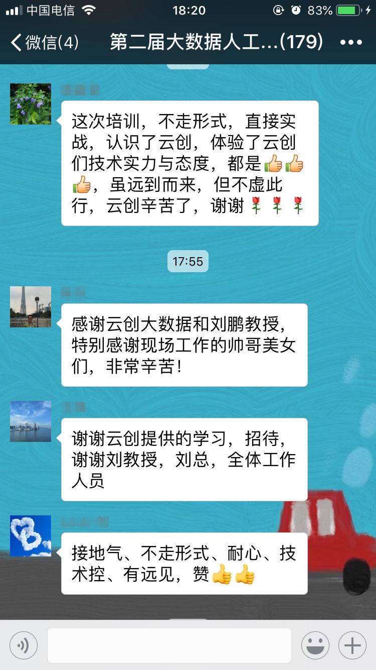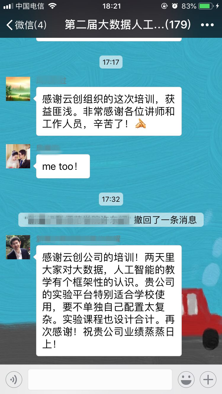 30日,培训班圆满落下帷幕。当参训老师们拿到云创颁发的结业证书时,纷纷表示此次培训收获颇多,不虚此行,相信日后这些培训干货会运用到大数据和人工智能的教学、实验中,培训更多此方面的人才。此外,对于能够提供给自己一个与专家沟通、与同行交流机会的云创大数据,参训老师表示非常感谢,并对会务组每一位工作人员的辛勤付出给予了好评。