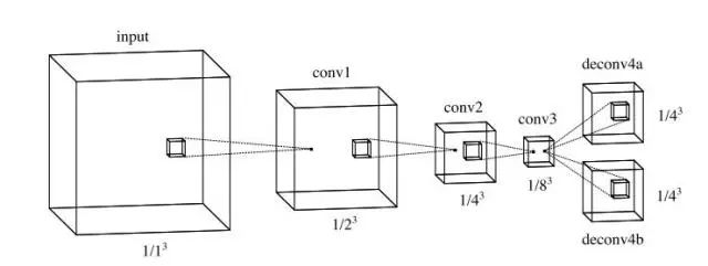 2D全卷积网络已经成功的应用于检测图像中的对象。我们将激光点云映射到为三维空间,该三维空间由许多边长10厘米的立方体拼接而成。将该空间作为3D全卷积网络的输入,这样充分利用了激光点云的三维信息。将三维数据输入全卷积网络后,通过三次反卷积提取特征图后,分别输出两个空间。一个空间用于判断一个对象的类别。另一空间用于估计某一对象的具体坐标。