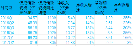 ),较2016年同期增长61%。从近几个季度的表现看,伴随着促成借款规模的增速趋向平缓,收入增速从之前的翻倍增长向平稳速度靠拢。