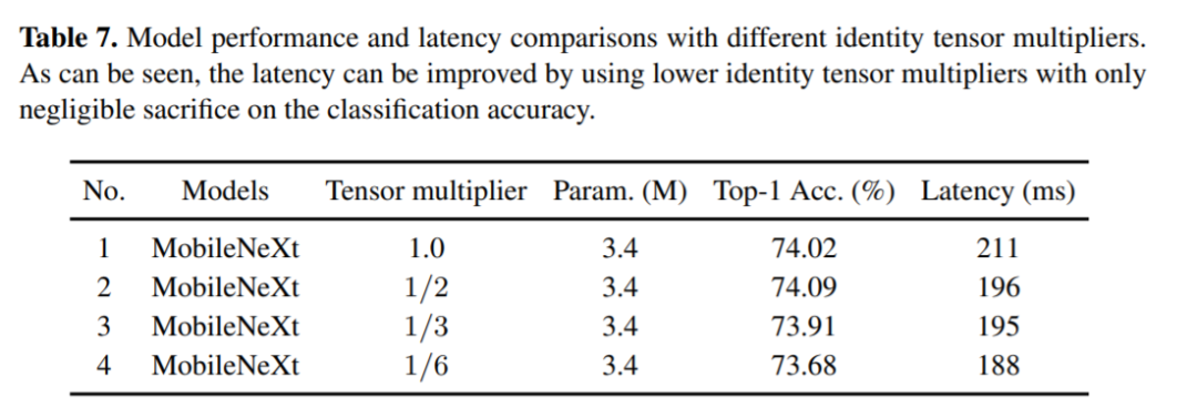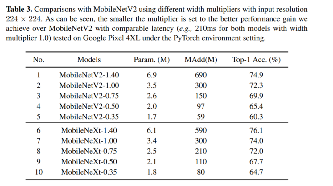 在PyTorch环境下,可以看到MobileNeXt在不同大小的模型下,精度均优于MobileNetV2,而且模型越小,这种优势越明显。