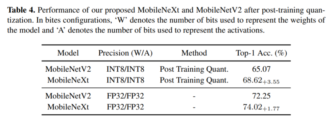 当与后训练量化方法结合时,MobileNeXt也有很大优势。(后训练量化可以简单看做模型压缩)