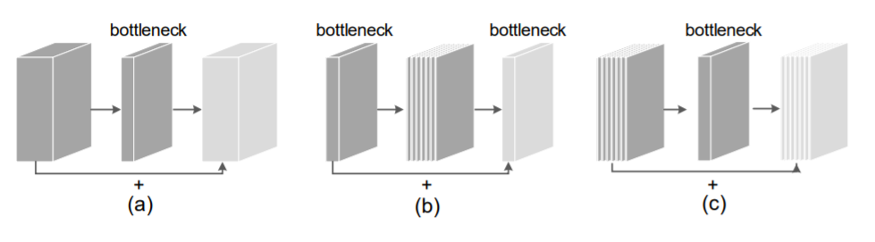 图二:a.瓶颈结构,b.倒残差结构,c.新的沙漏型瓶颈结构