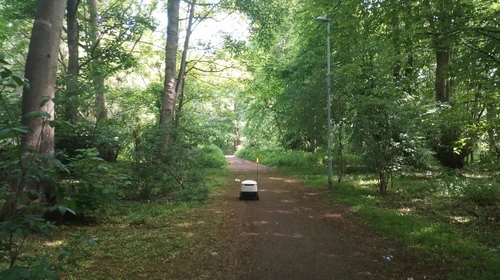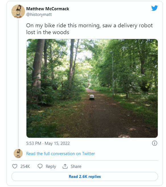 随后,麦科马克将这张照片发到了Twitter上,并写到,“早上骑自行车时,看到一个快递机器人在森林里迷路了。”
