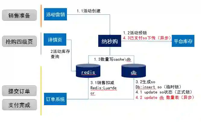 3. 针对抢购、团购等活动库存场景,新建纳秒购系统来提供高并发、高性能的库存服务,和普通库存进行独立设计和分开部署。