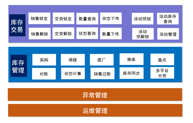 库存系统从业务架构上分为库存交易、库存管理、异常管理、运维管理四大组成部分。