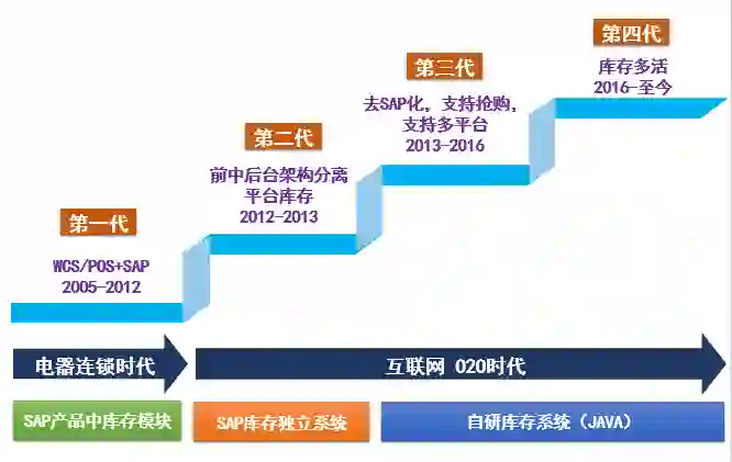 阶段3: 2013-2016,多平台销售战略时代,苏宁入驻天猫,当时系统采用“去商业软件,崇尚开源”思路,新建JAVA自研库存系统;