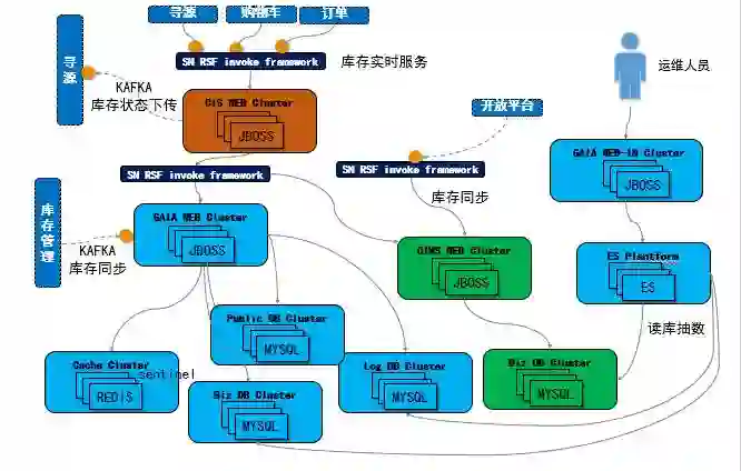 库存路由系统CIS提供库存的统一服务路由、服务流控、服务降级、接口熔断等系统组件;自营库存交易系统GAIA和C店库存交易系统SIMS提供高性能的库存数量查询、销售锁定、销售解锁、交货锁定、交货解锁等库存服务,库存交易系统的数据由自营库存管理系统SIMS和商家库存管理系统SOP提供数据同步。苏宁库存可以在易购平台、天猫平台、当当平台等多平台上进行销售。基于大数据的智能分货引擎在库存管理系统SIMS中实现多平台分货。