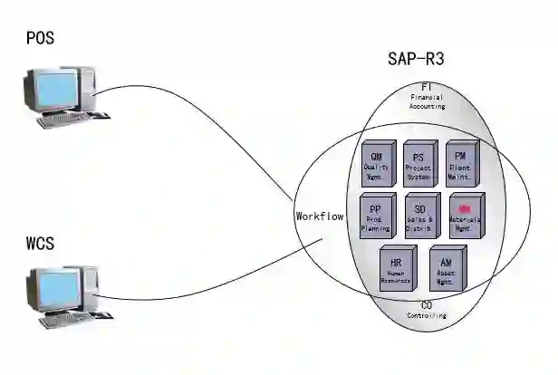 线下连锁时代的电商初期总体架构,线下销售采用POS客户端系统,线上销售采用WCS (IBM WebSphere Commerce)(JAVA)系统,服务端采用SAP-R3商业软件。如图4。