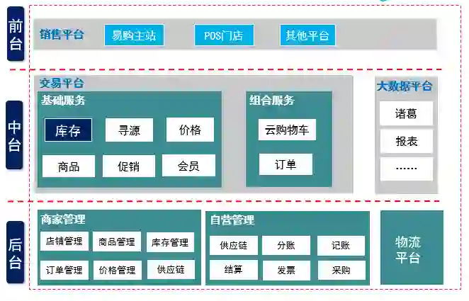 基于前台浏览、销售交易、销售履约&运营管理的业务划分和归类,我们对系统进行了前台、中台、后台的架构分离。前台由各个销售平台组成,比如易购主站、门店POS系统、电话销售,以及其他销售平台,负责用户体验和商品展示;中台是核心交易平台,提供库存、寻源、价格、商品、促销、会员等基础服务、以及提供云购物车、订单等组合服务,同时中台提供诸葛等一系列基于大数据的报表和应用,后台是提供苏宁自营(供应链、分账、记账、结算、发票、采购等)、商家运营(店铺、商品、库存、订单、价格、供应链管理等)的一套运营管理平台、还有大物流平台。如图6。图6 前中后分离-总体架构图