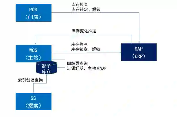 线下门店POS系统和线上主站WCS(IBM WebSphere Commerce)系统调用SAP-R3提供的库存检查、库存锁定、库存解锁等服务,同时,为了减轻线上主站对后端服务系统的压力,SAP-R3会将库存数量的变化主动推送给WCS系统,在WCS系统本地暂存一份影子库存数据,WCS商品详情页加载商品信息时,先查询本地的影子库存,判断如果影子库存过了保鲜期(有效期),则进行库存懒加载,实时调用SAP-R3的库存数量查询服务,再更新本地影子库存;另外,主站搜索系统也是基于WCS本地的影子库存数据来创建和更新索引。系统交互关系如图5。