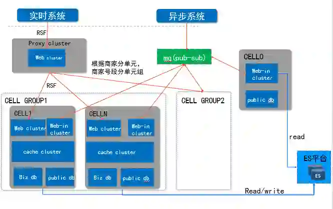 单元采用商家编号hash取模的维度进行单元的划分。多个单元组成一个单元组。跨单元的一些管理功能基于ES(Elastic Search)平台提供服务。