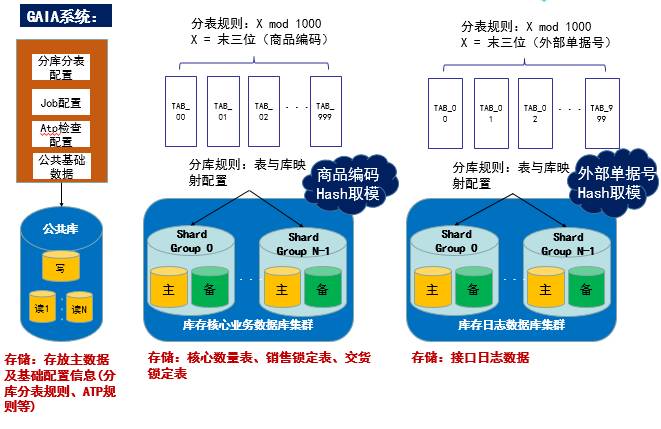 以自营库存交易系统GAIA为例,库存从数据架构上进行了水平和垂直拆分,分为公共库、业务库和日志库。