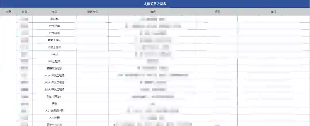 这个客户关系不仅是记录人员岗位、姓名等信息,主要的是要有辨识度,比如,性格如何,家庭住址,好不好沟通等等,这些对你协作匹配性更有帮助。