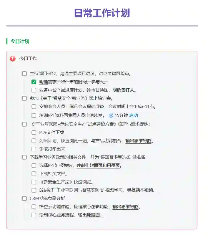 关于清单的编写,不在于格式和内容,而在于结构化、务实,要有输出成果的要求,越是可以量化衡量的就越容易达成,剩下的就是坚持和反复练习,形成工作习惯。