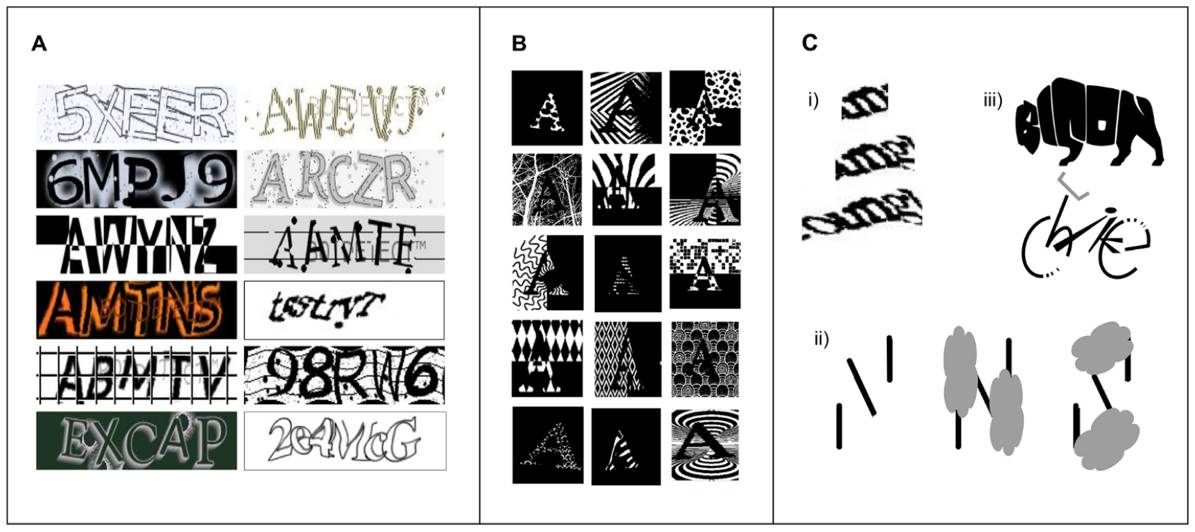 图1.人类在字母形式上感知的灵活性。(A)人类擅长解析不熟悉的字体。(B) 相同的字母可以有很多的表现形式,人类可以从上图中识别出“A”。(C) 常识和上下文信息会影响人类对字体的感知:(i)“m”还是“u”或“n”; (ii) 同样的线条中,不同位置上的遮挡会影响对其理解为“N”还是“S”; (iii) 对形状的感知会帮助识别图中的“b,i,s,o,n”和“b,i,k,e”。(摘自[1])