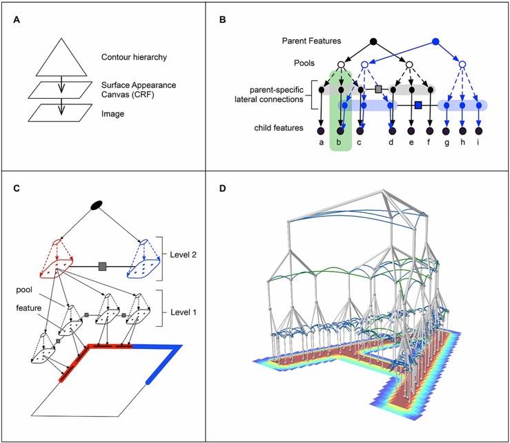 图5. RCN的推理算法。(A) (i) 通过前向传递,包括侧连接传递,生成字符假设。这里PreProc是一类Gabor算子,生成像素上的边界概率。(ii) 反向传递和侧连接传递从之前的假设中选取了“A”。(iii)“A”和“K”之间产生了一个错误的假设“K”,可以通过上下文解析消除错误假设。(iv)多个假设联合解释了图中的字母,包括对分离、遮挡的推理。(B)第二层上的特征学习。着色圆圈代表激活的特征,虚线圆圈代表最终选取的特征。(C)从边缘的相邻结构中学习侧连接。(摘自[1])