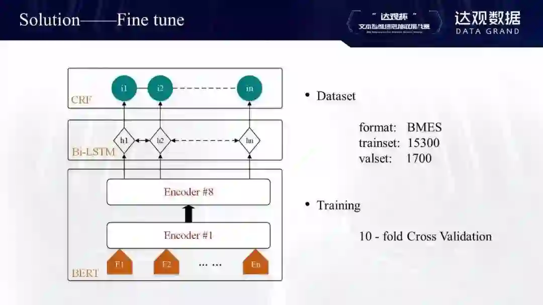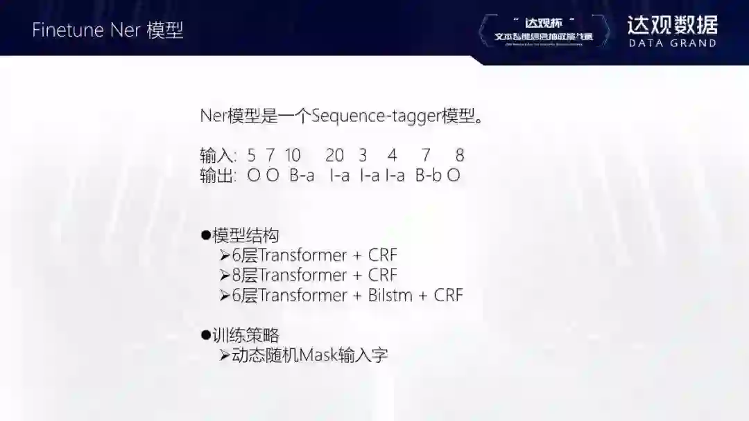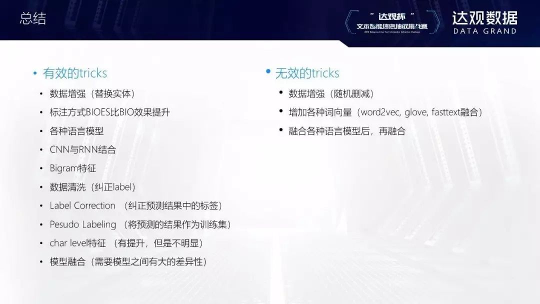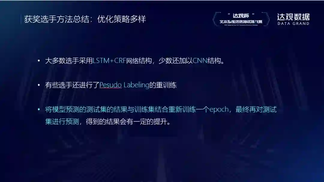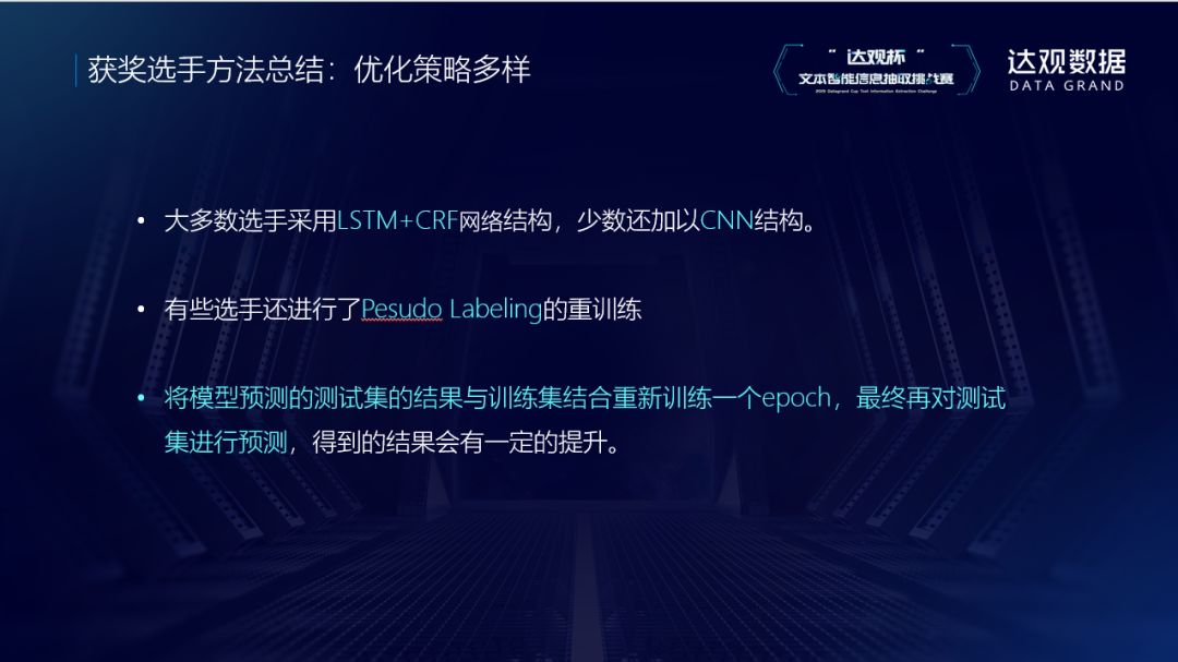 网络结构大部分都是都是LSTM/biLSTM+CRF,有些选手也使用CNN提取一些局部特征在公司内部,有时候也会不用LSTM这一层,直接用BERT接CRF。还有的参赛者用伪标签的形式,这个算法的效果可能不太稳定,因为它用预测出的结果再去做训练,可能会越训越好或越教越差。最后是数据扩充的思路,可以把测试集一起用于训练。