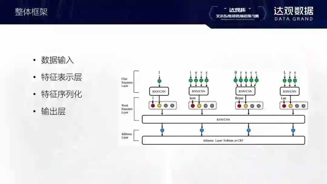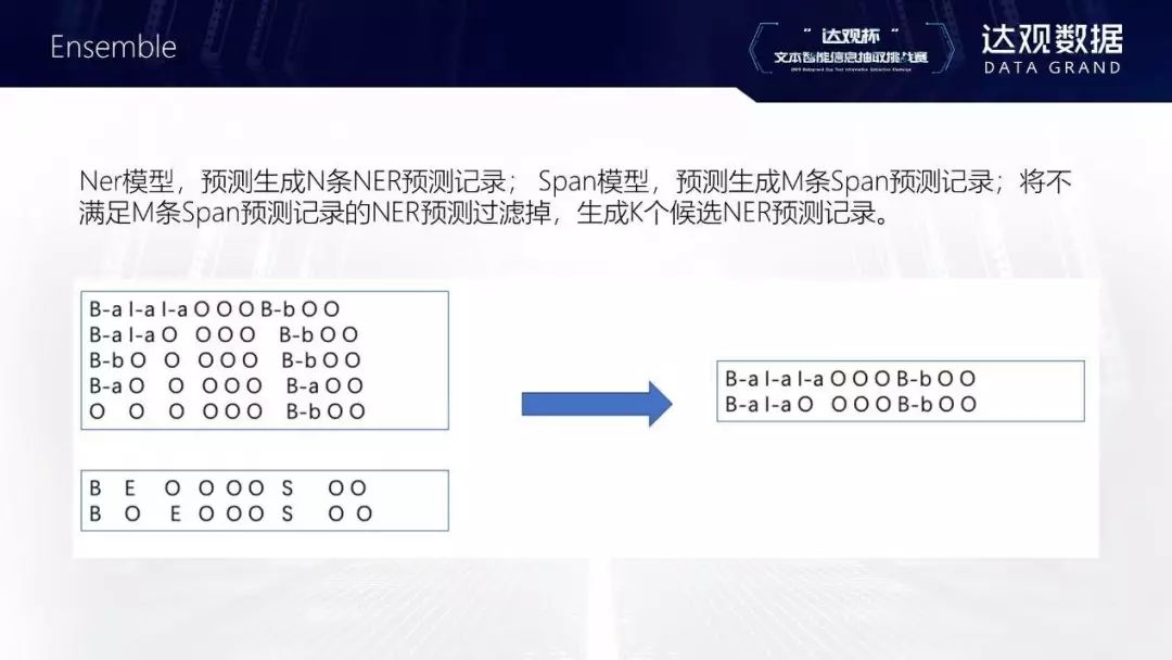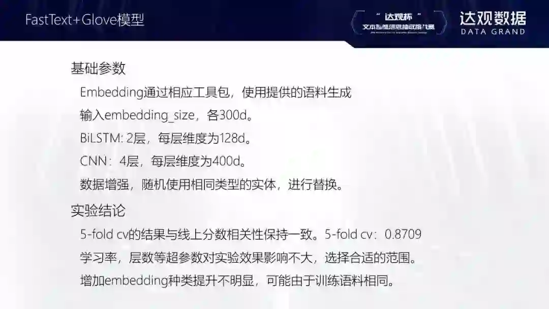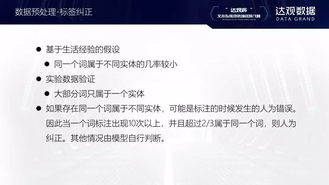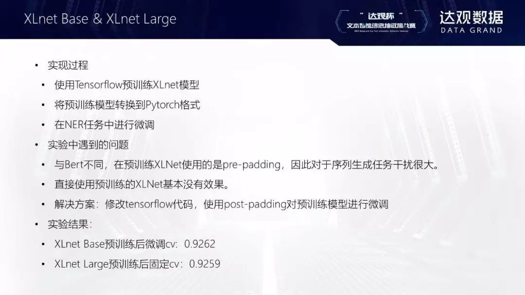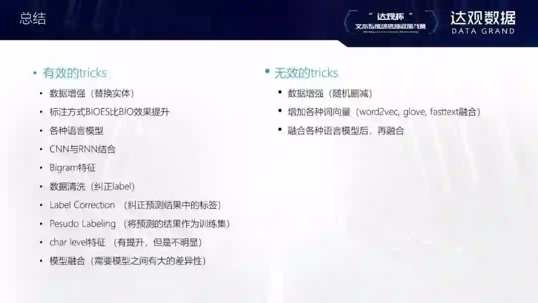 网络结构大部分都是都是LSTM/biLSTM+CRF,有些选手也使用CNN提取一些局部特征在公司内部,有时候也会不用LSTM这一层,直接用BERT接CRF。还有的参赛者用伪标签的形式,这个算法的效果可能不太稳定,因为它用预测出的结果再去做训练,可能会越训越好或越教越差。最后是数据扩充的思路,可以把测试集一起用于训练。
