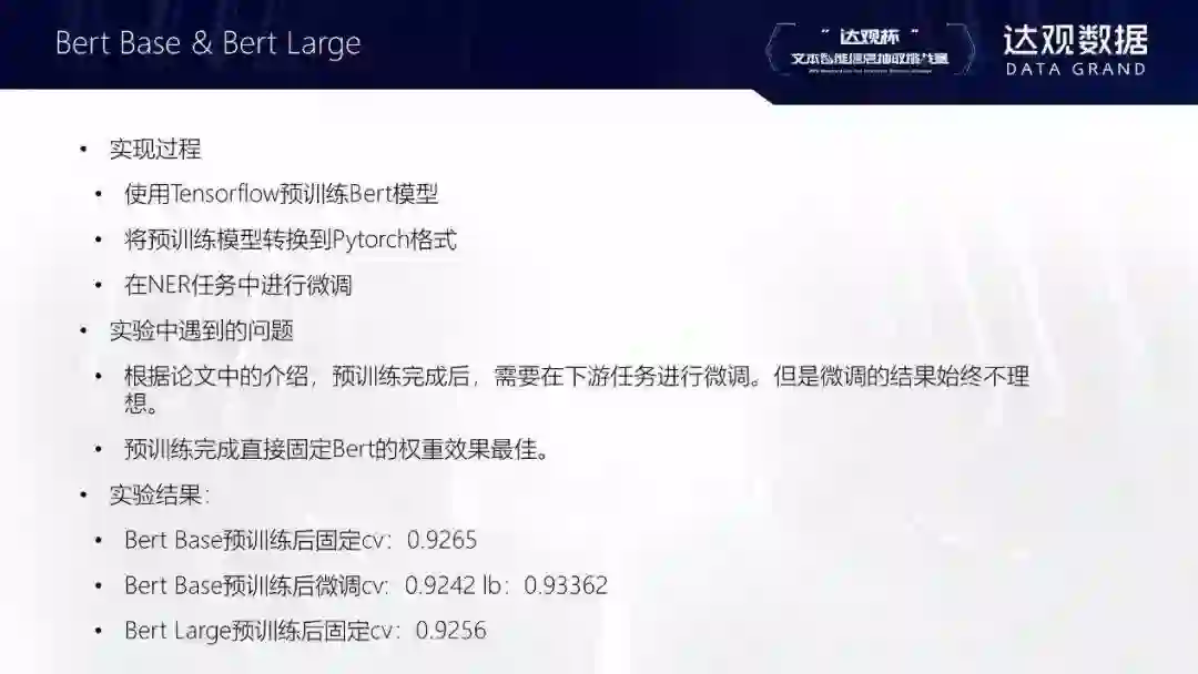 比赛过程中,主要的困难在于bert模型的pretraining,因为硬件资源的限制(大部分参数选手会遇到的问题),需要对bert模型的超参数进行调整,如transformer层数、intermediate_size、batch_size等,进而降低模型参数量;其次是针对fine tune阶段loss、acc指标所对应的token与线上提交时F1指标对应的entity不同进行调整,手动修改crf层的transition matrix;最后的模型融合阶段,是从token级别进行融合还是从entity级别进行融合,需要权衡。
