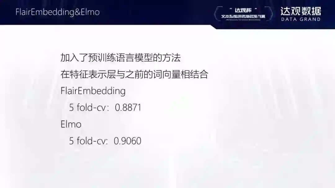 第二个阶段是简单的预训练语言模型的引入。在这个阶段,传统的word embedding方法已经很难取得提升。因此我尝试了简单的预训练语言模型,如FlairEmbedding,ELMO以及层数较少的Bert等。这些模型也可以在消费级GPU上进行训练。同时效果会相比于word embedding有所提升。