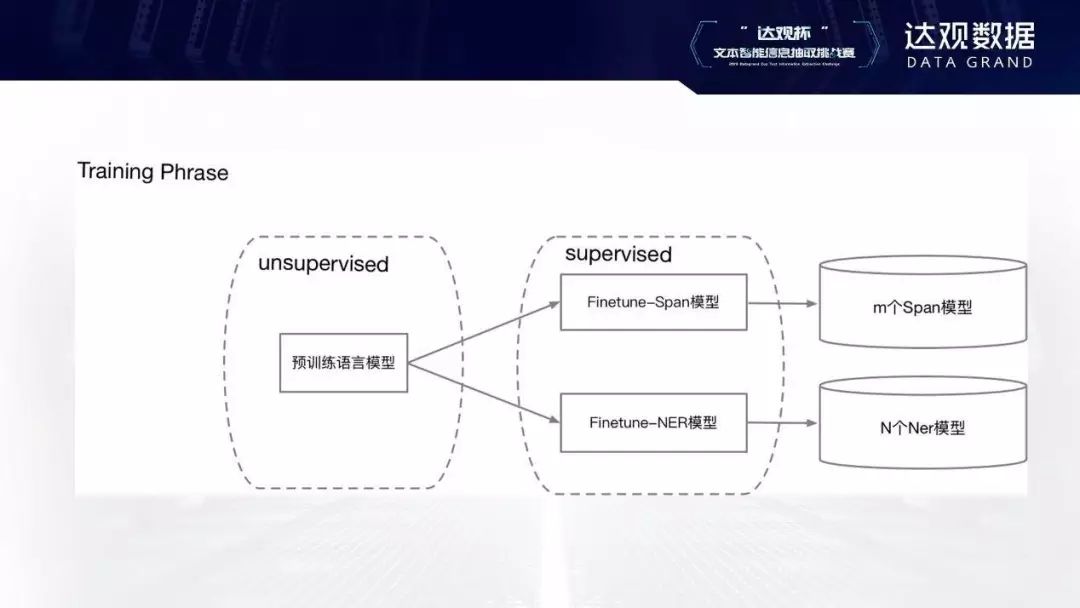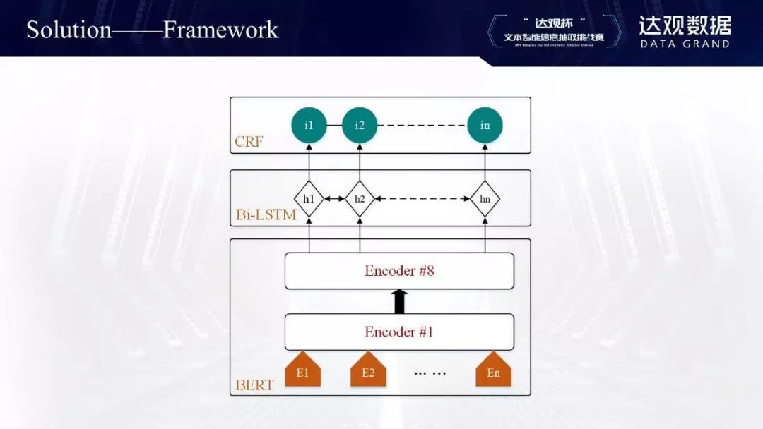 我的框架和其他选手差不多,基本模型是BERT,后面接了双向的LSTM,后面再加条件随机场。下面主要从预训练和finetune两个阶段跟大家分享。