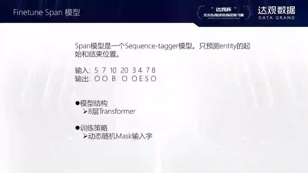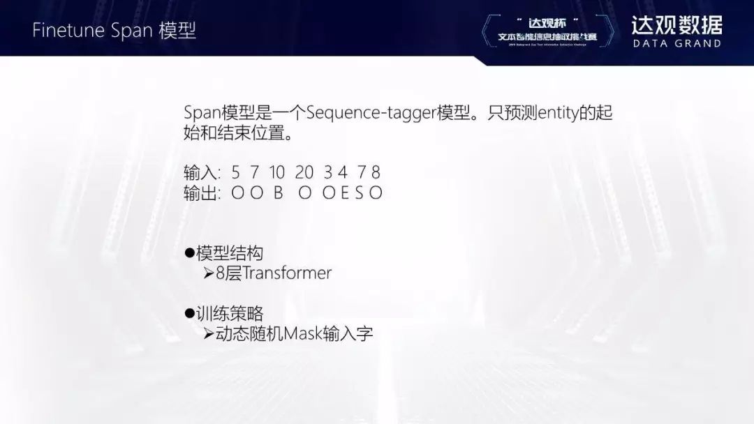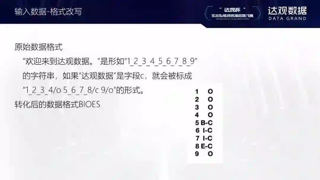 这次比赛有两个特别之处。一是对比赛的文本数据进行了加密,每个字都被映射到了一个整数上。标注好的数据为什么要做一个ID映射?这是因为比赛组织者希望参赛者不要用一些比赛的窍门,而是专注于算法本身。另外在实际应用中也会出现类似的场景——某些特定领域的文本即使是中文,也未必很容易看懂。如果要在这些文本上抽取内容,场景会和这次比赛非常相似。