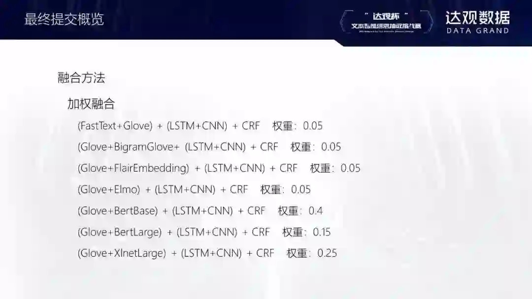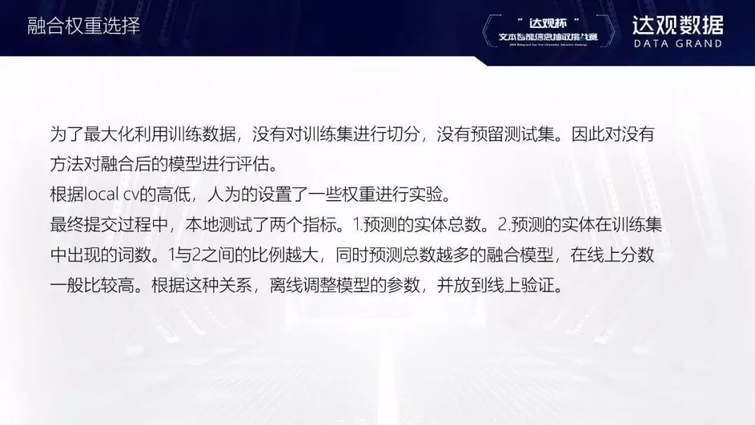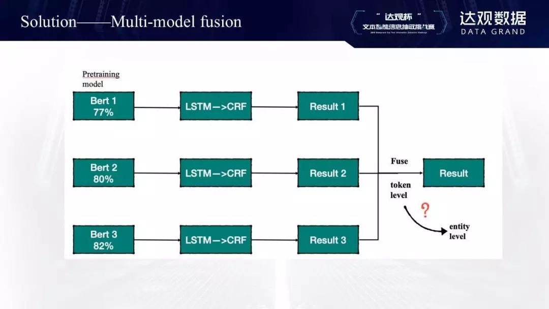 最后是模型的融合。因为预训练模型花的时间比较久,我选择了三个基础模型,第一个是77%,第二个是80%,最终训练模型是82%。融合是按照1:1的权重正常投票去做的(token level),未来可以试一下以实体的level去融合。