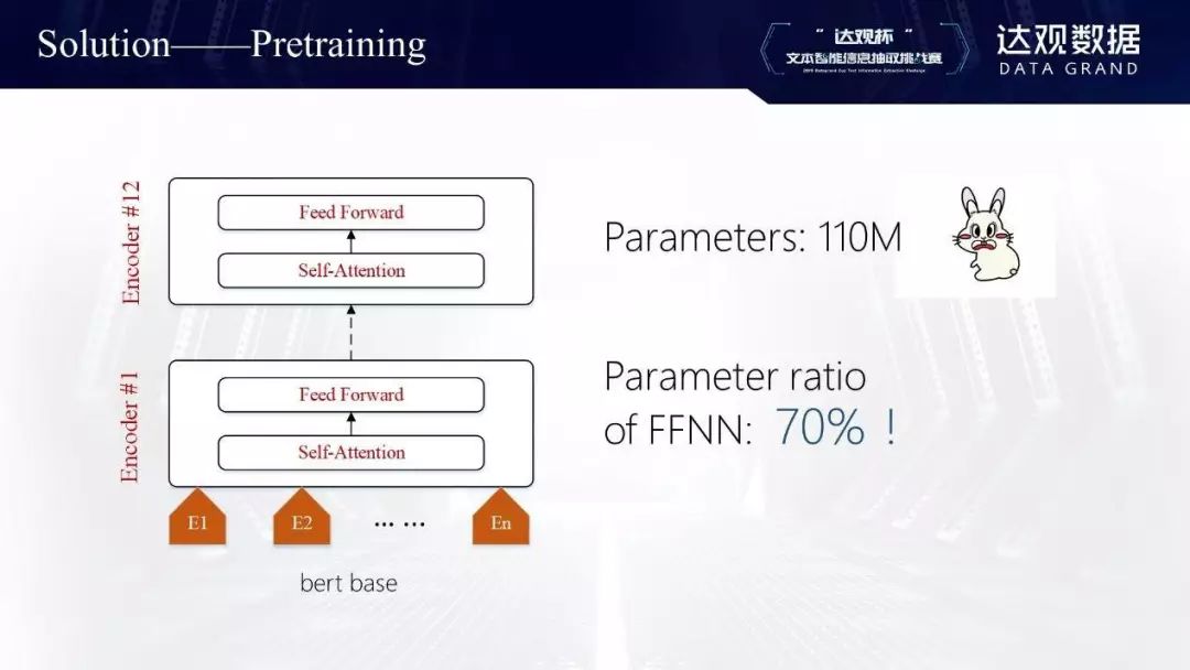 个人认为,BERT模型里起到更重要作用的是self-attention,但是它的参数占比仅为30%左右(单层transformer中)。Feedforward层的参数占了70%,所以我从这方面入手调整。