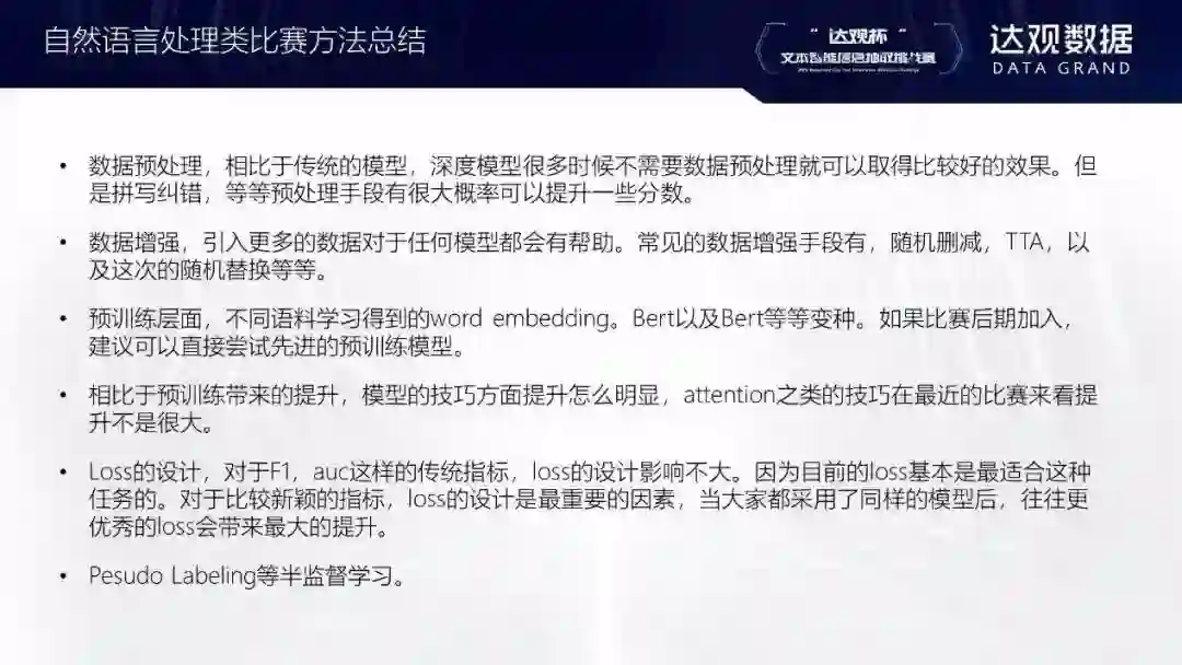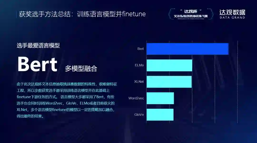 本次比赛的获奖选手方法各异,但也有一些共同的趋势。首先就是BERT已经成为了无法回避的主流框架和做文本信息挖掘的标准。目前很多公司的业务涉及大量非监督数据,所以BERT可以提供很大的帮助。选手也使用了word2vec等其他预训练模型,说明这些模型仍然能经得起考验。公司内部其实也使用这些模型,因为性能较好,效果也不错。