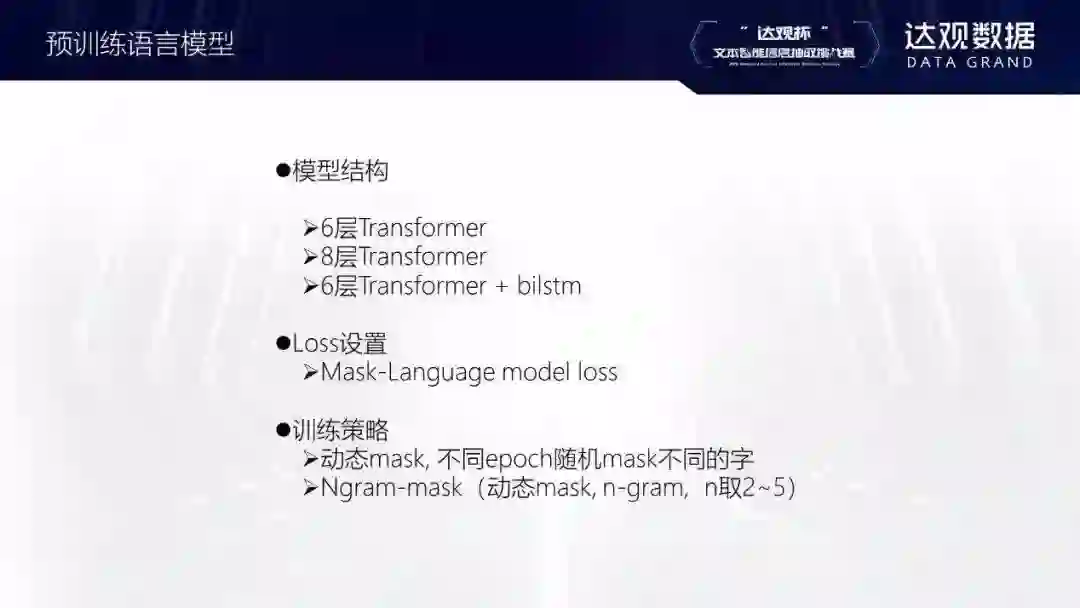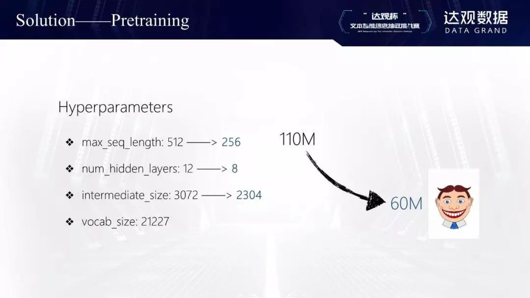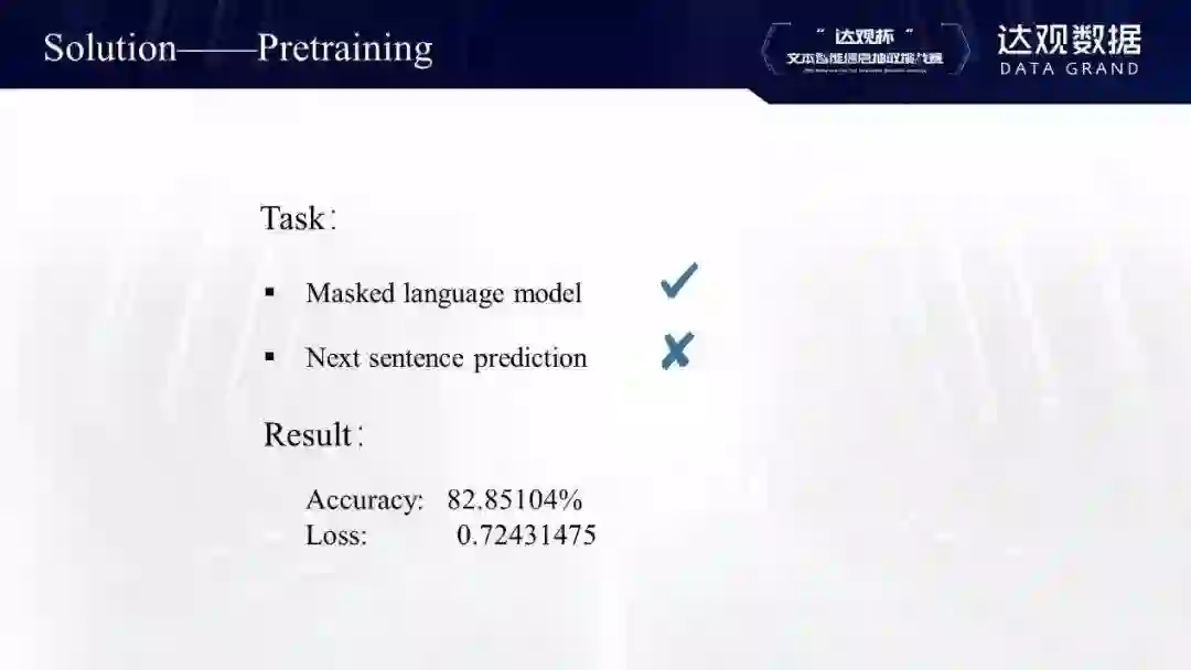 从任务来讲,原始的BERT预训练包含两个任务:一个是Masked Language Model,还有一个是Next Sentence Prediction。因为比赛数据是脱敏的,而且现在有研究表明Next Sentence Prediction任务好像对于某些下游任务有些损害,所以只用了第一个Masked Language Model任务。比赛组织者提供了160万条corpus数据,在生成预训练数据过程中,把dupe_factor设置成10,最终得到到1600万条数据。