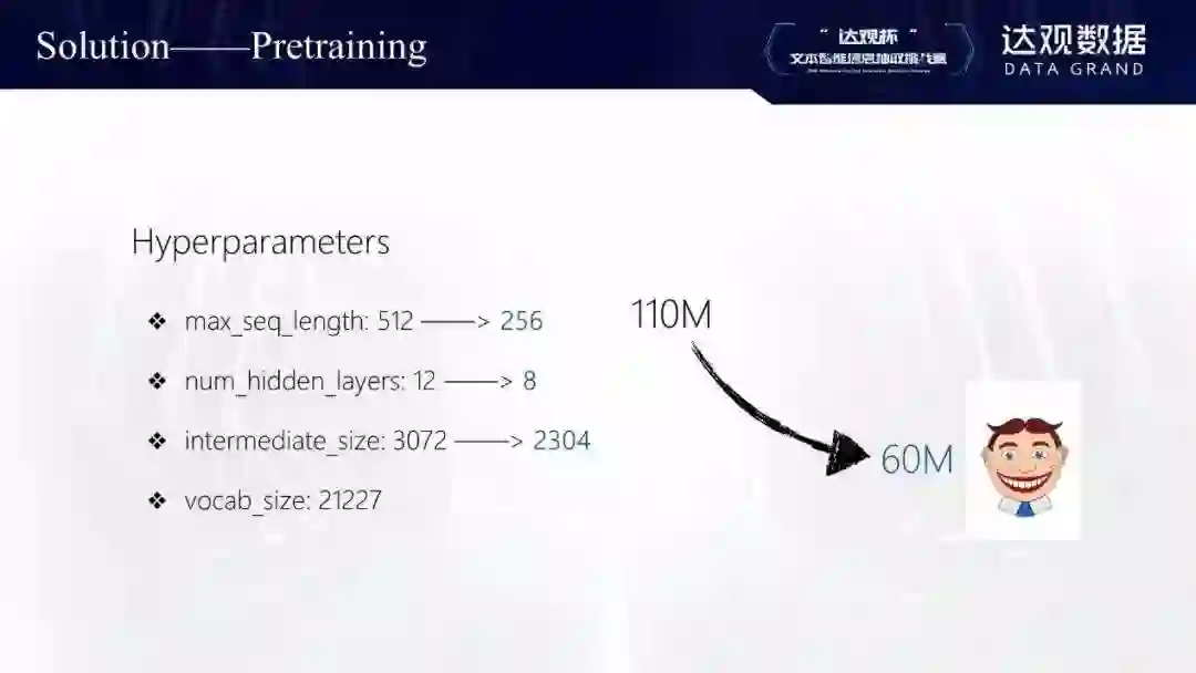 最后调整结果如上图所示。max_seq_len设为256,这是基于对数据的分析: 99%以上的数据都在256以下。Num-hidden-layers设置成了8。Intermediate_size是全连接层参数,我改成2304,这一改动使feedforward层参数占比降至60%。Vocab size是根据语料统计,设置为21227,最终经过调整,参数量从110兆降到60兆,这样2个11G的GPU可以设置较合理的batch_size。