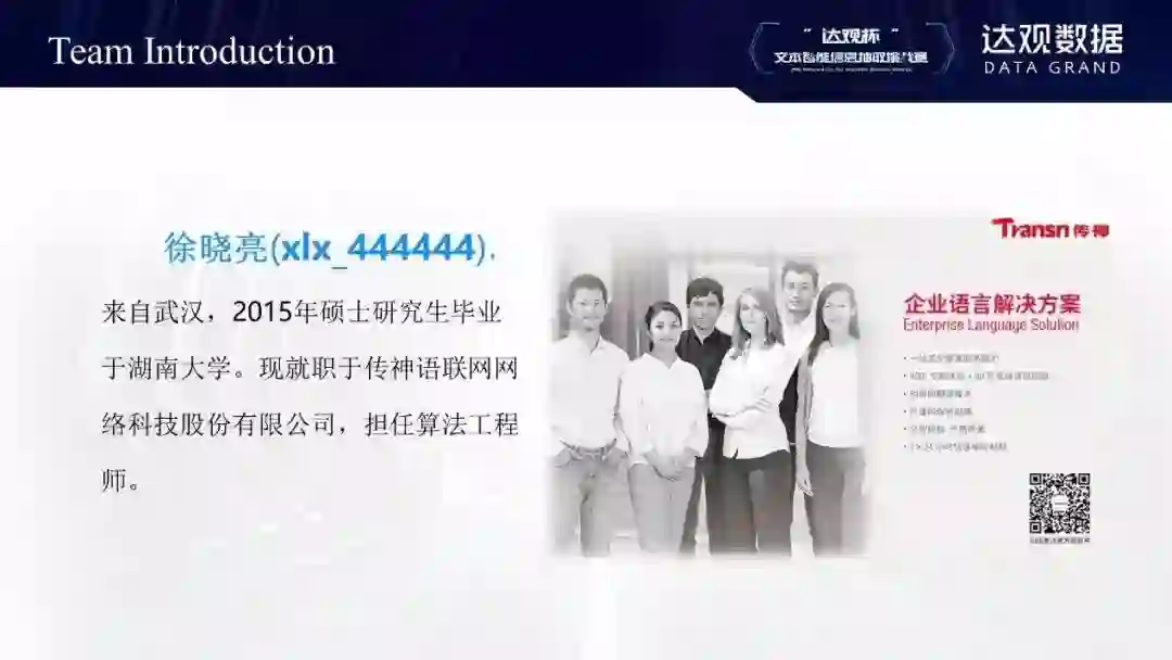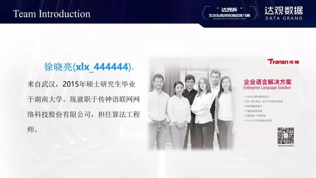 我是徐晓亮,以个人身份参赛。我来自武汉,2015年硕士研究生毕业于湖南大学。现就职于传神语联网网络科技股份有限公司,担任算法工程师,主要从事机器翻译、文档分类、信息抽取等nlp相关工作。