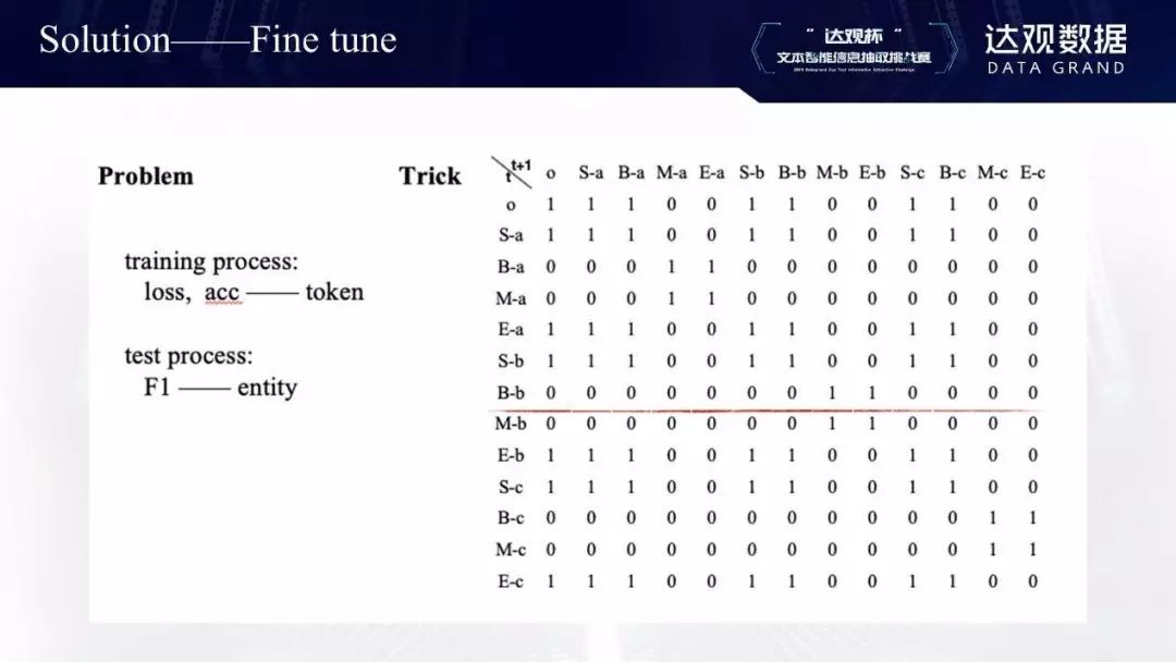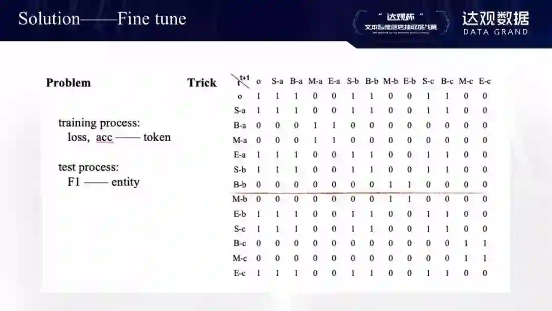 微调过程中存在的问题:我们在训练时的loss和acc都是针对每个token,但是提交测试时得分F1针对的却是entity。针对这一问题,我在微调过程中加了一个人工限制,以这行为例,比如t时刻的label是B-b,那么t+1时刻就限制只能是M-b或者E-b,其他全部设成0(当然,实际过程是把它设置为较小负数)。经过人工约束后,大概有0.3-0.4的F1提升)。