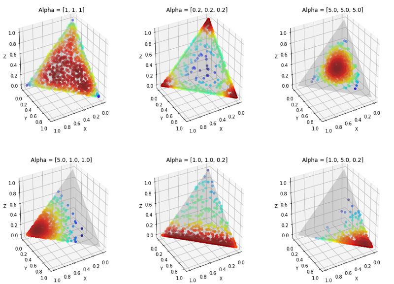 你需要记住的要点如下:大的 α取值会将空间分布向三角形的中间挤压,而较小的α取值则将空间分布推向三角形的角落。