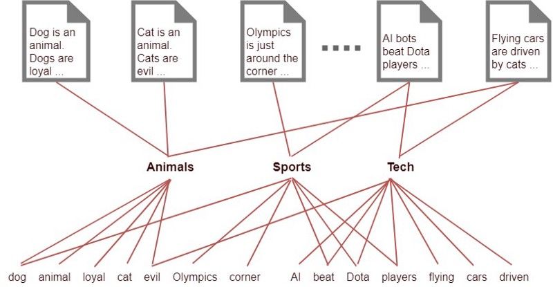 注意:我这里使用的主题(“Animals”, "Sports","Tech")是虚构的,真正的求解结果如使用(0.3*Cats, 0.4*Dogs, 9,0.2*Loyal,0.1*Evil)表示“Animals”这个主题,即如前所述,每篇文档为单词的分布。