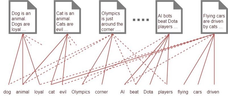 比如你有1000个单词的集合(即所有文档中最常见的1000个单词)和1000份文档。假设每份文档平均有500个单词出现在这些文档中。你怎么知道每篇文档属于哪个类别?一种方法是将每篇文档使用一根线连接到每个出现在文档中的单词,如下图所示: