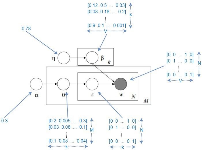 在上图中,α和η被显示为常量,但是实际上却复杂得多。例如,针对每一篇文档,α都有一个主题分布(就是例图中的场地θ)。理想状态下,是个(M x K)形状的矩阵。针对每一个主题,η都有一个参数向量,η的形状将是(k x V)。在上图中,这些常量实际上是矩阵,通过向每个单元复制一个单一值,从而形成了这些常量。