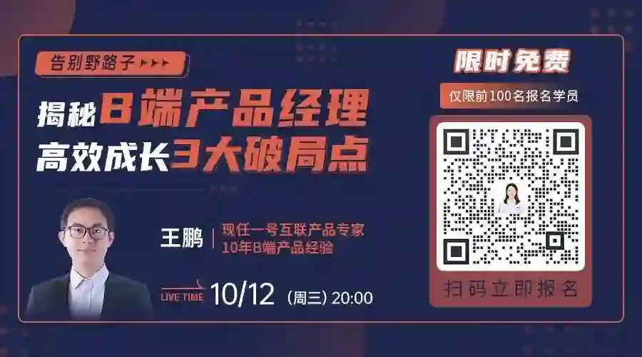 10月12日(周三)晚8点,10年B端老司机@王鹏老师在线分享,带你明晰B端产品经理发展路径,揭秘高效成长的三大破局点,告别野路子。