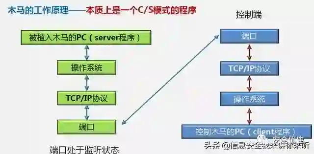 (2)潜伏性:木马能够毫无声响地打开端口等待外部连接。