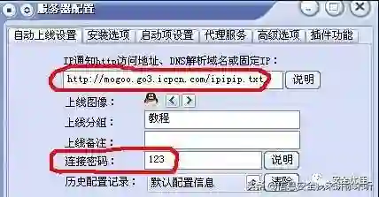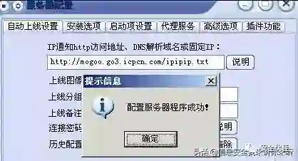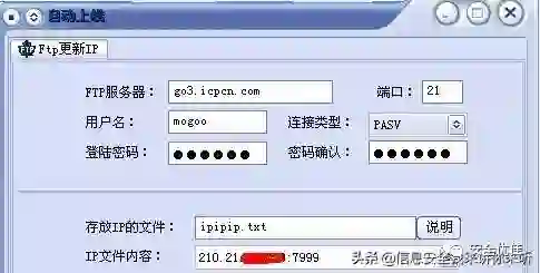 下来点配置服务程序,先点自动上线设置,IP通知那里添上你FTP在HTTP的访问地址加上你放IP文件的地址