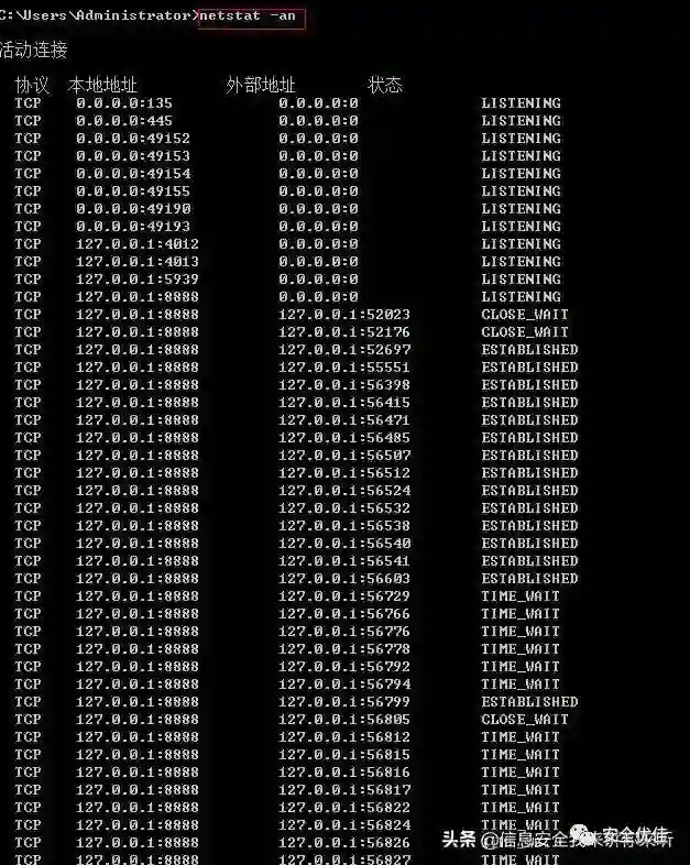 具体的步骤是点击"开始" "运行" "cmd",然后输入netstat -an这个命令能看到所有和自己电脑建立连接的IP以及自己电脑侦听的端口,它包含四个部分——proto(连接方式)、local address(本地连接地址)、foreign address(和本地建立连接的地址)、state(当前端口状态)。通过这个命令的详细信息,我们就可以完全监控电脑的网络连接情况。