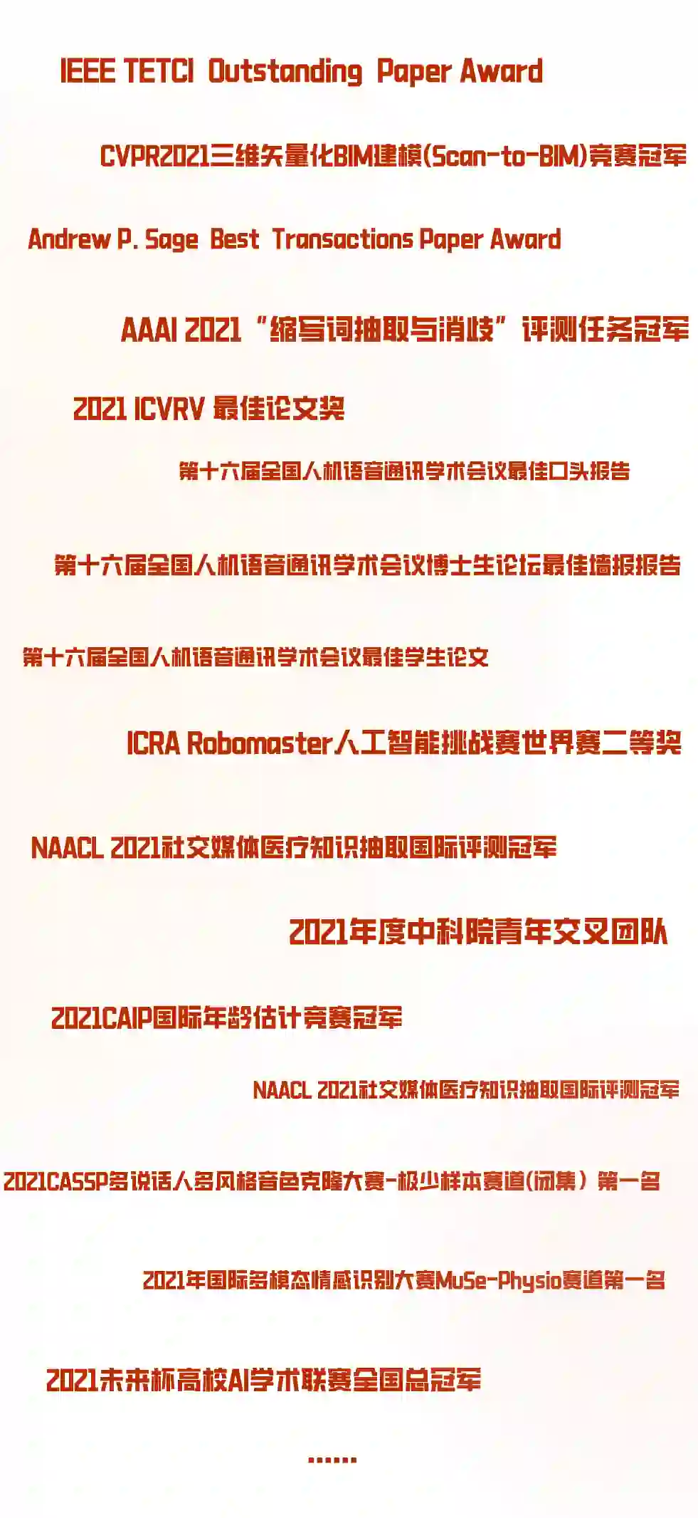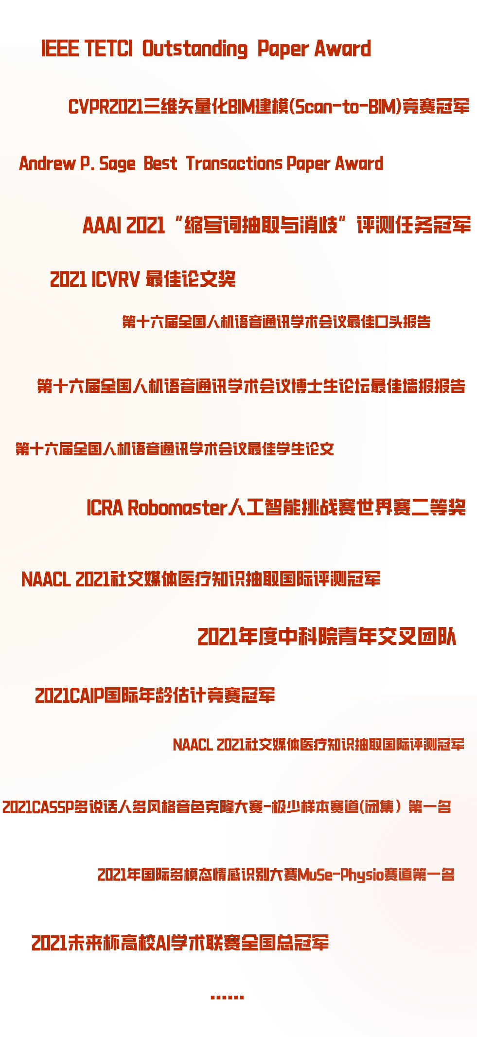 近年来,自动化所共获得省部级以上奖励30余项。发表论文数量逐年增加,质量不断提高;专利申请和授权量连年攀升,多年位居北京市科研系统前十名。绘制的“脑网络组图谱”第一次建立了宏观尺度上的活体全脑连接图谱,获得国际同行的广泛关注和好评;量化神经处理器(QNPU)通过自主创新的架构设计和神经网络优化技术,首次在资源受限的芯片上实现了大规模深度神经网络的独立计算,处于业界领先水平。生物特征识别技术实现了从中距离到远距离的可识别生物特征信息(虹膜-人脸-步态)全覆盖,研制成功一系列自主知识产权的远距离虹膜人脸多模态身份识别产品,在国家重要安全领域推广应用,相关技术入选2018年度“十大技术突破”;音智能处理整体解决方案已经受过大规模实际应用检验,系统接口已成为行业标准;基于自动化所语音识别技术的“紫冬语音云”在淘宝、来往等阿里巴巴旗下移动客户端产品中得到推广;“分子影像手术导航系统”通过国家药监局医疗器械安全性及有效性检测认证并进入临床应用;“仿生机器鱼高效与高机动控制的理论与方法”获得2017年度国家自然科学奖二等奖,研制的机器海豚实现了1.5倍体长的最高直线游速,并在国际上首次实现了机器海豚完全跃出水面;“智能视频监控技术”和“人脸识别技术”分别成功应用于2008年北京奥运会、2010年上海世博会的安保工作中,为社会安全贡献自己的力量;研制的AI程序“CASIA-先知1.0”采用知识和数据混合驱动的体系架构,在2017首届全国兵棋推演大赛总决赛中7:1的悬殊比分战胜人类顶级选手,展示了人工智能技术在博弈对抗领域的强大实力;与中国日报社合作构建“全球媒体云”综合平台,受到广泛好评;研制的电子光学玻璃印刷全自动AOI智能检测设备,可全面监控丝印关键制程品质情况,实现整个丝印工艺的全自动化生产,该技术一举填补了电子玻璃行业空白;“基于ACP方法的石化企业智能管理系统及应用”先后应用于茂名石化、齐鲁石化,为实现企业生产管理的精细化提供了有效的工具,并荣获“中国石油与化工自动化行业科技进步一等奖”……