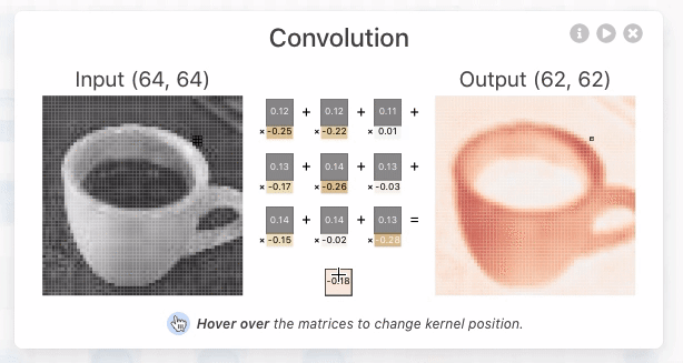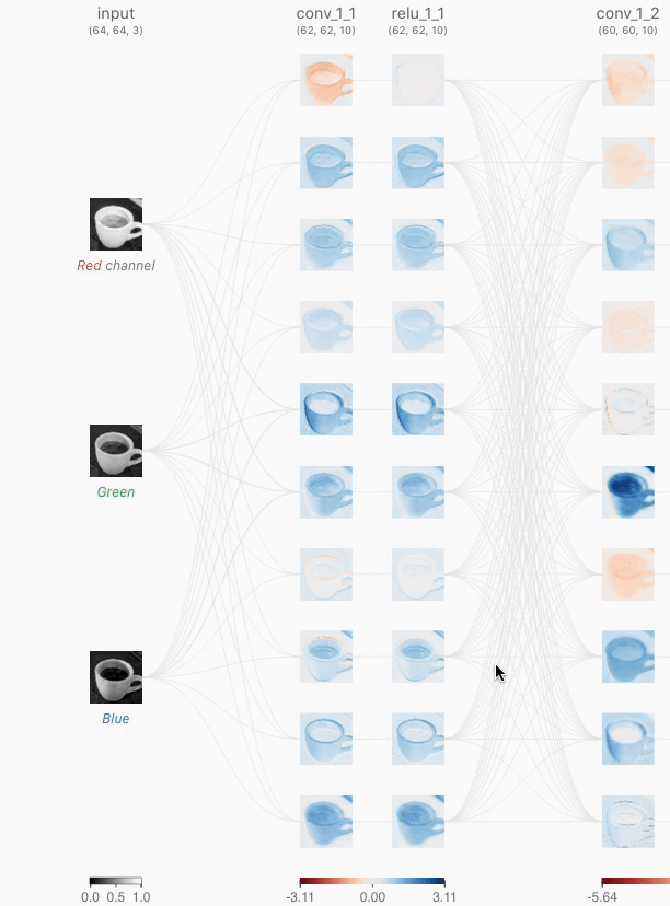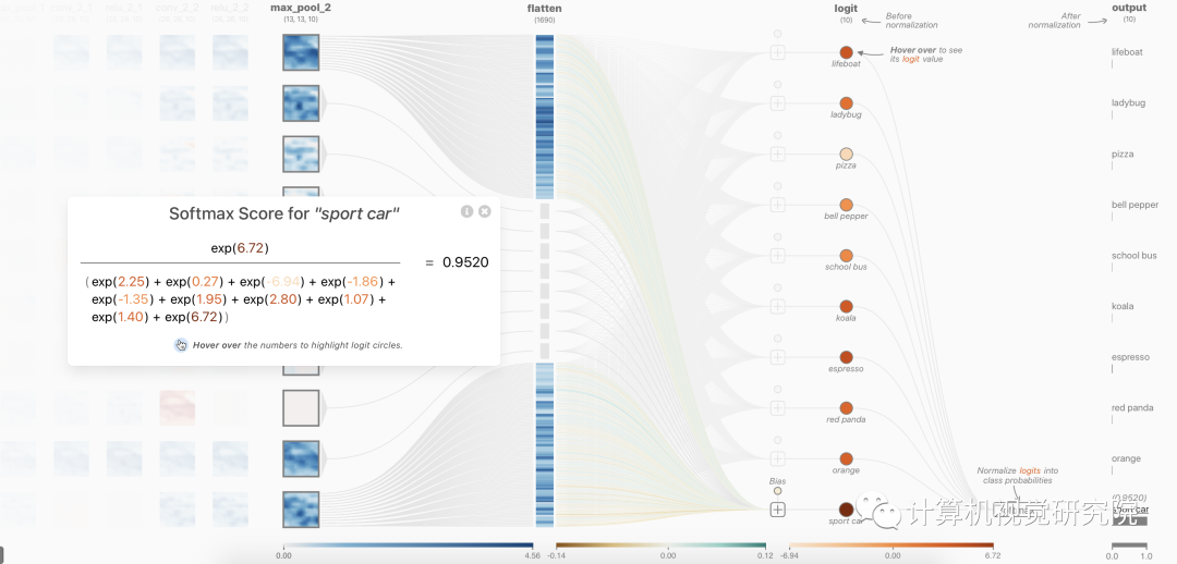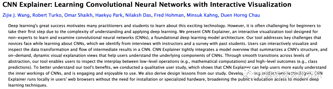 这个工具到底把 训练过程展示的多么详细?简单来说,项目作者已经给你做好了一个可以交互的界面,你只需要打开浏览器加载出这个界面就可以了。CNN Explainer 使用 TensorFlow.js 加载预训练模型进行可视化效果,交互方面则使用 Svelte 作为框架并使用 D3.js 进行可视化。最终的成品即使对于完全不懂的新手来说,也没有使用门槛。下面我们来看一下具体的效果。