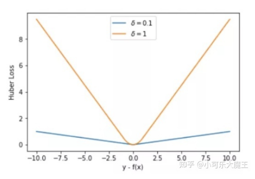 Huber函数是对MAE和MSE二者的综合,其在函数值为0时,它也是可微分的。,其包含了一个超参数δ,δ 值决定了 Huber侧重于 MSE 还是 MAE 的优秀形式表现